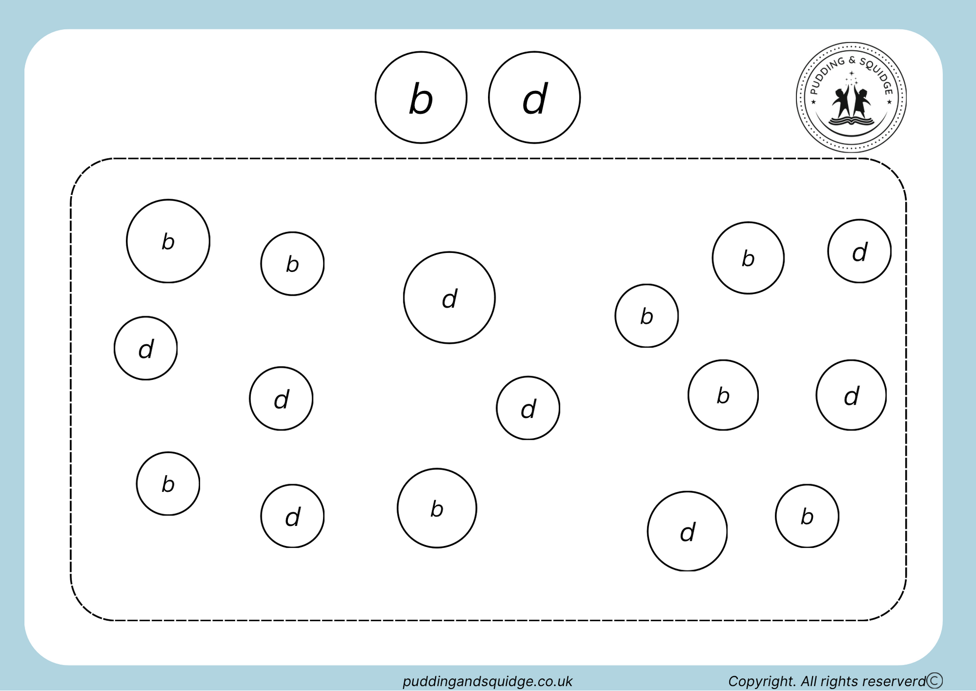 A fun game where the aim is to identify which letter is a b and which is a d. These are commonly confused. All you need to do is to colour in the b and d at the top of the page, then hand it over and ask the child playing to complete the rest using the same colours.