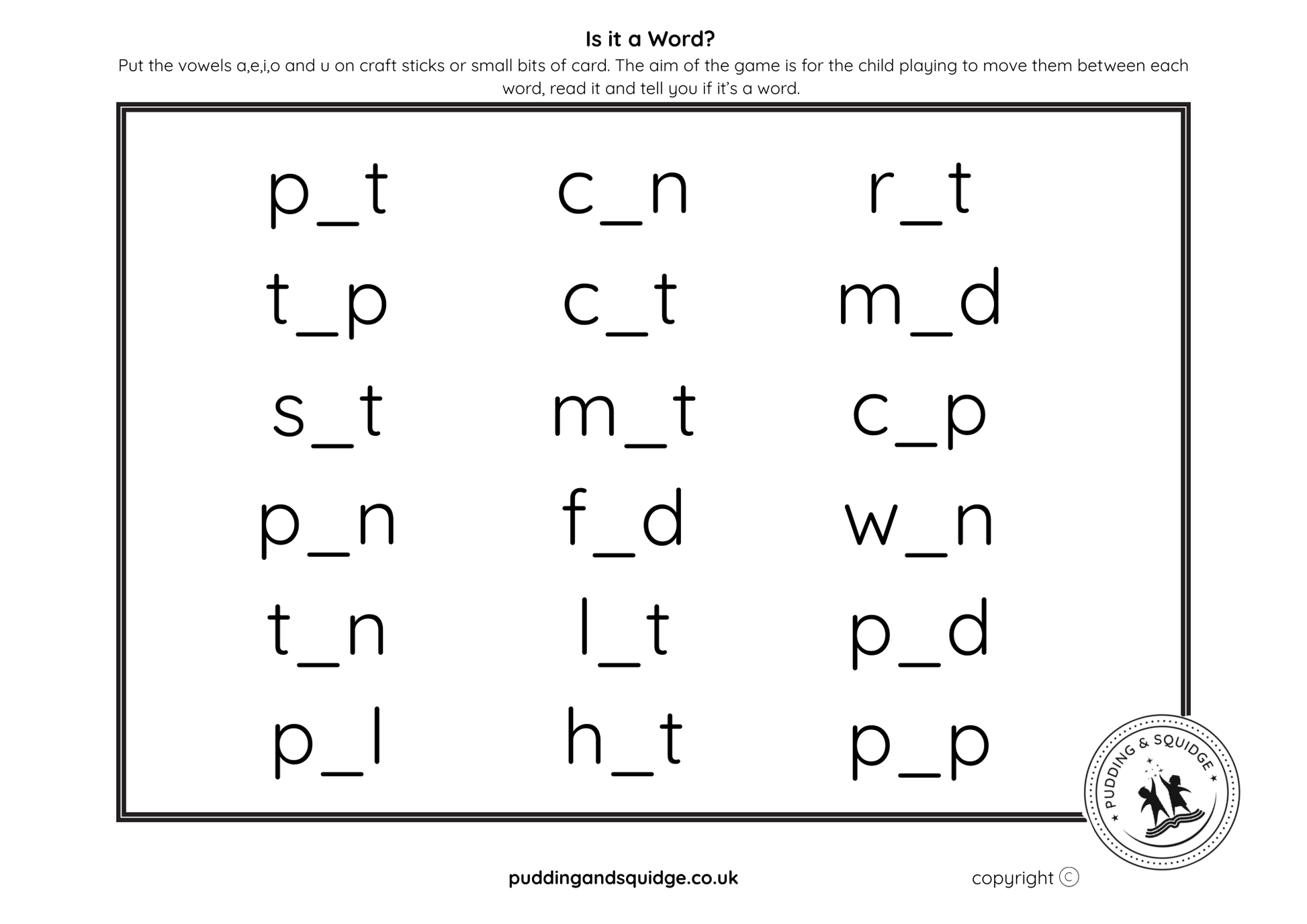 A digital download to help early readers. CVC words are a great place to start with some of those phonics sounds. To play this game all you need to do is write vowels on craft sticks and ask the child playing to move the sticks between the words